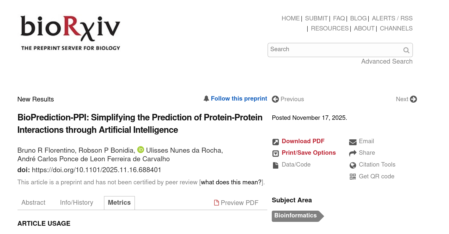 [Article][Preprint] FLORENTINO, Bruno R.; BONIDIA, Robson et al. BioPrediction-PPI: Simplifying the Prediction of Protein-Protein actions through Artificial Intelligence. bioRxiv, p. 2025.11. 16.688401, 2025.
