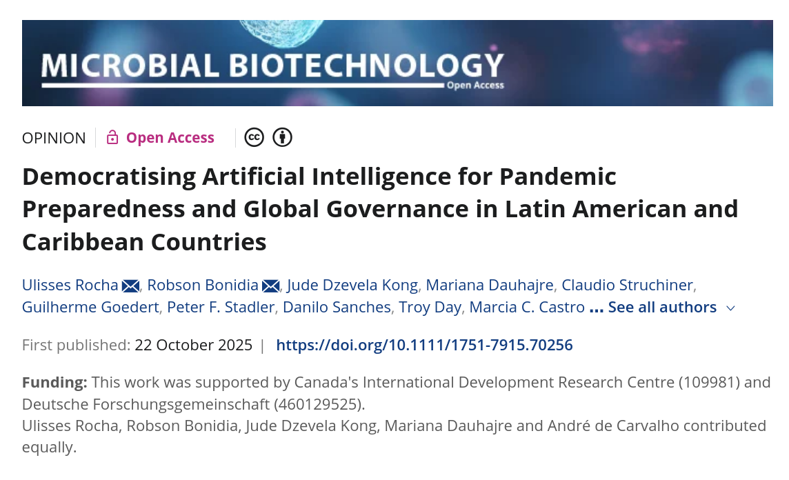 [Article][IF 2024: 5.200] ROCHA, ULISSES; BONIDIA, ROBSON; et al. Democratising Artificial Intelligence for Pandemic Preparedness and Global Governance in Latin American and Caribbean Countries.Microbial Biotechnology (Online), v. 18, p. 01, 2025.