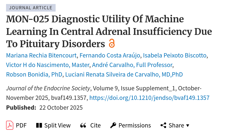 [Article][IF 2024: 3.100] RECHIA BITENCOURT, MARIANA; COSTA ARAÚJO, FERNANDO; PEIXOTO BISCOTTO, ISABELA; DO NASCIMENTO, VICTOR H; CARVALHO, ANDRÉ; BONIDIA, ROBSON; SILVEIRA DE CARVALHO, LUCIANI RENATA. Diagnostic Utility Of Machine Learning In Central Adrenal Insufficiency Due To Pituitary Disorders. Journal Of The Endocrine Society, v. 9, p. 01, 2025.