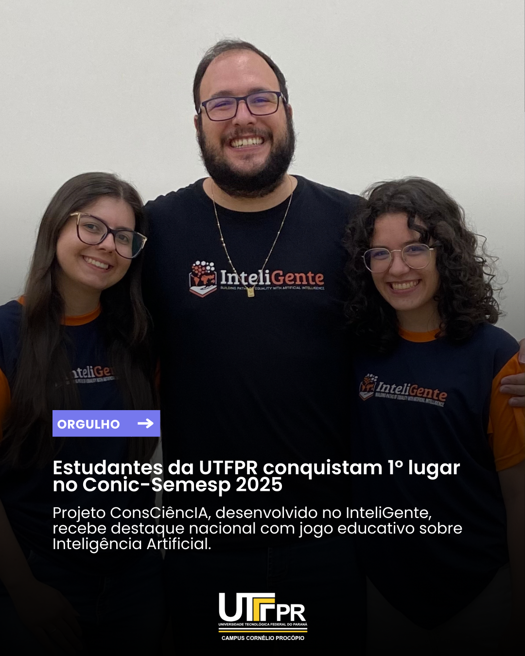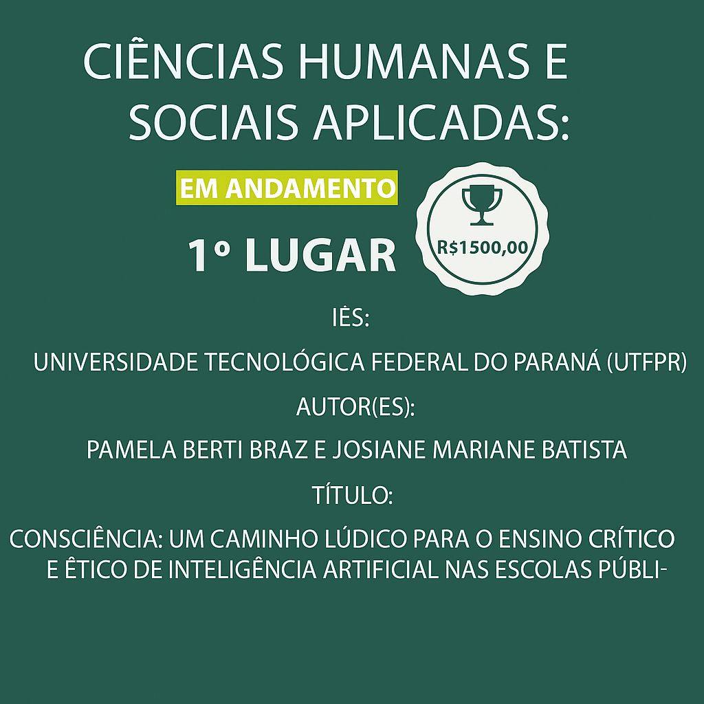 [Article][Conference] BATISTA, J. M.; BRAZ, P. B.; BONIDIA, ROBSON P. ConsCiêncIA: Um Caminho Lúdico para o Ensino Crítico e Ético de Inteligência Artificial nas Escolas Públicas. In: XV Seminário de Extensão e Inovação & XXX Seminário de Iniciação Científica e Tecnológica da UTFPR, 2025, Curitiba.